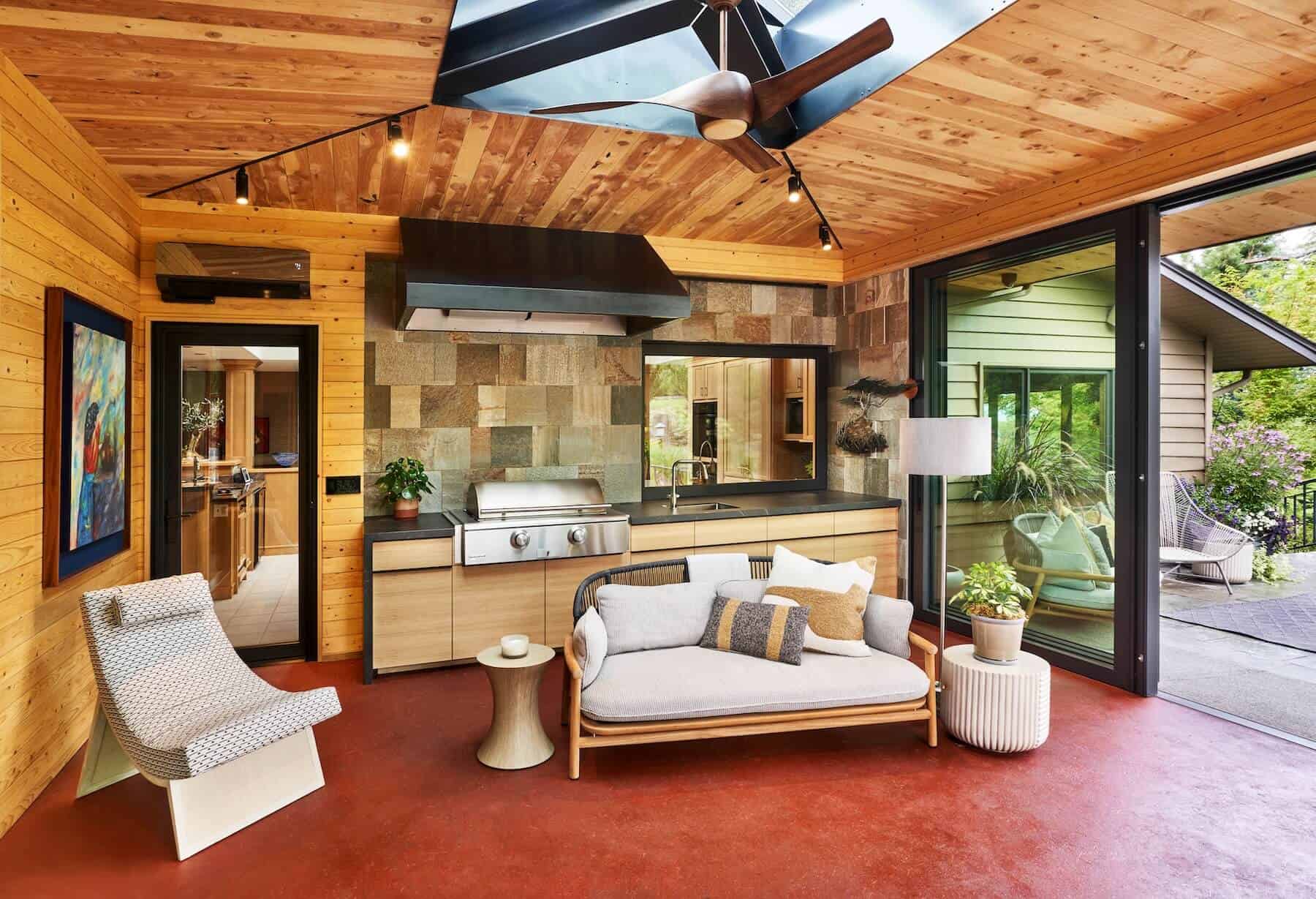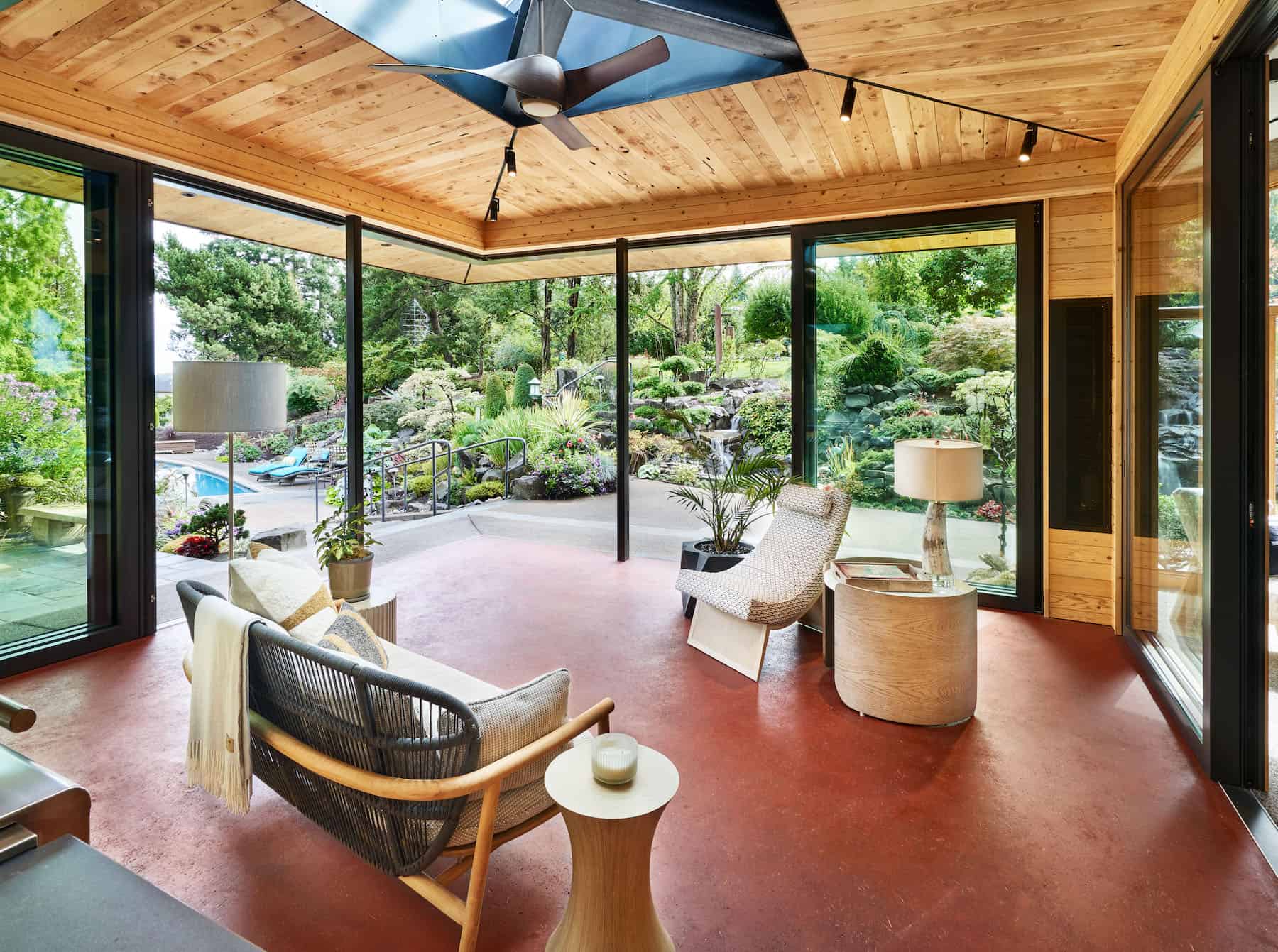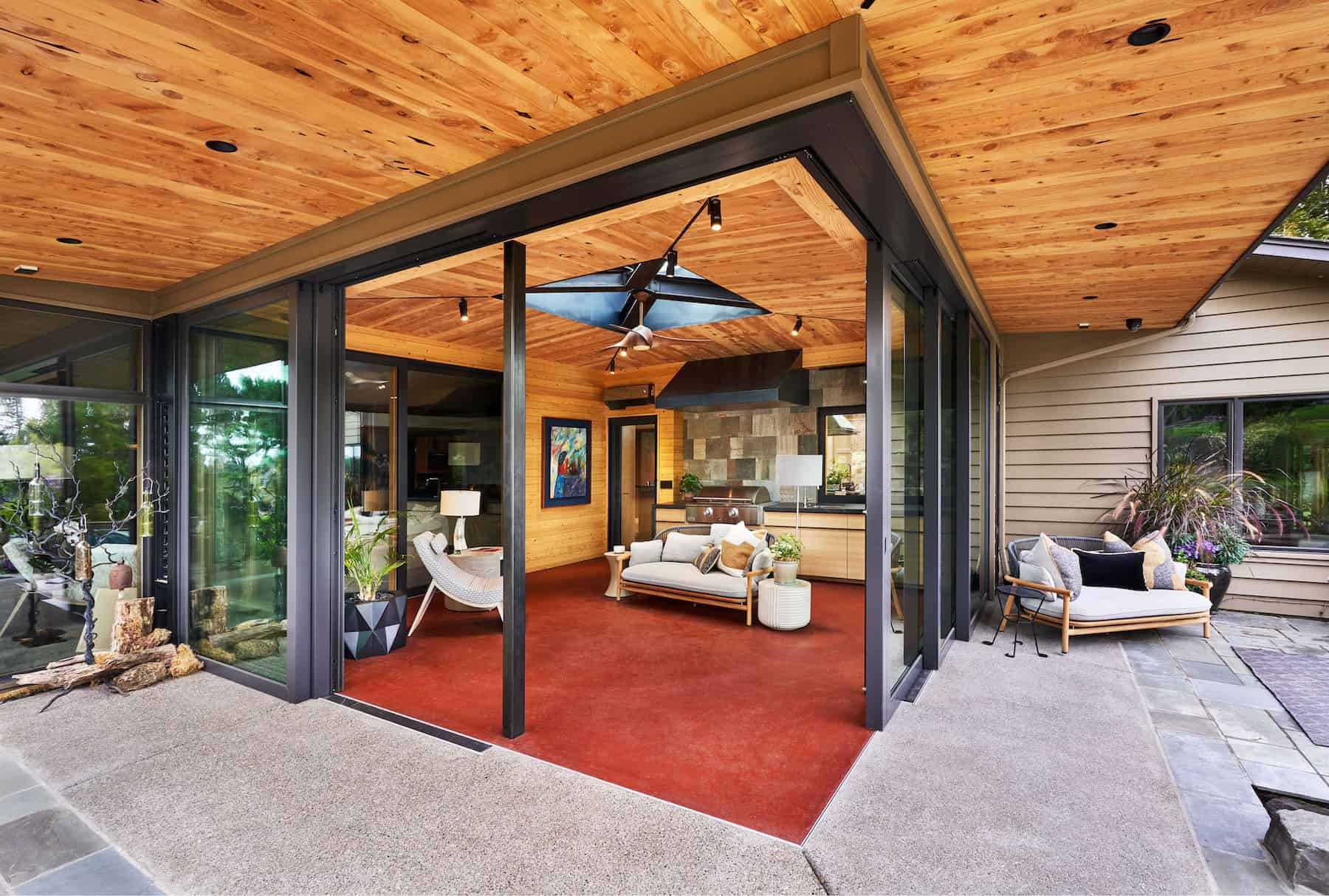 This renovation had a specific intent, which was to provide our client (and their guests) a four-seasons space from which to enjoy the beauty of their surroundings. Clean lines, natural finishes (like quarried stone, clay floor, sustainably harvested, local woods), and multi-panel lift-slide doors all conceal some of the most technically demanding square footage we’ve built.